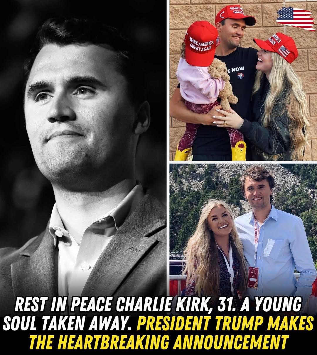May be an image of 5 people and text that says 'yAKE C名在力 MAKE MAKEAMERACA AMERICA GREA AGAN 滋情 JERICA 4 M E NOW REST IN PEACE CHARLIE KIRK, 31. A YOUNG SOUL TAKEN AWAY. PRESIDENT TRUMP MAKES THE HEARTBREAKING ANNOUNCEMENT'